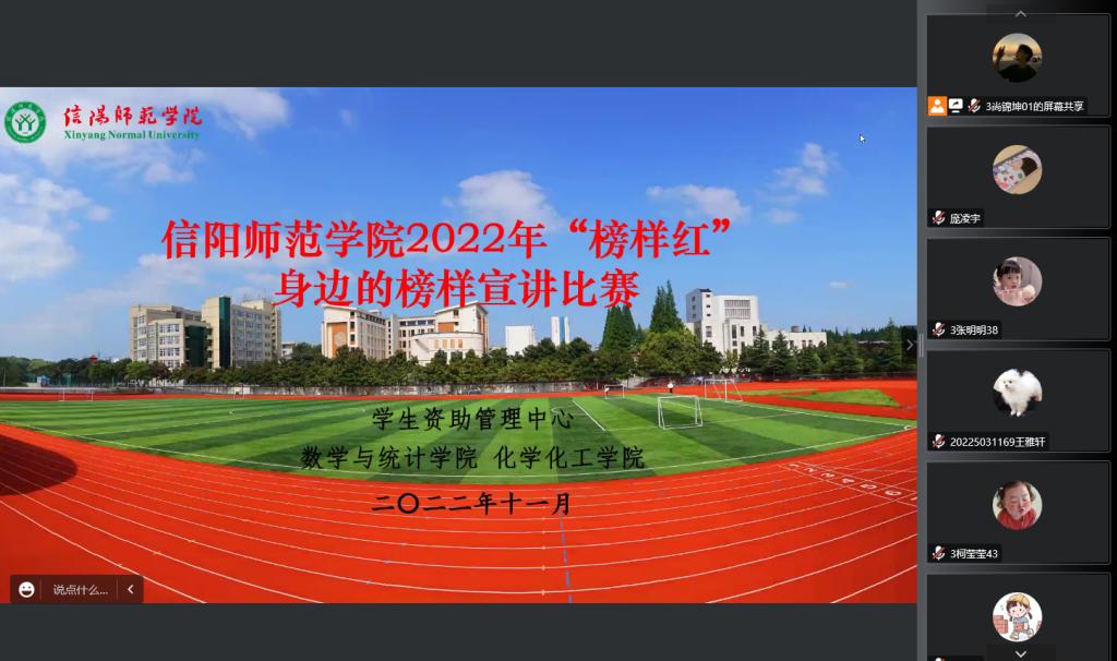 为进一步贯彻落实资助育人工作要求,全面落实国家资助政策,发挥榜样示范引领作用,学习榜样事迹、发挥榜样力量、争当榜样的浓厚氛围,进一步加老员工资助宣传力度,扩大宣传效果,2022年身边的榜样宣讲活动于11月30日以线上腾讯会议形式开展,公司资助专员杨帆老师、化学化工公司资助专员赵方方老师以及两院两百余名员工参加此次会议。