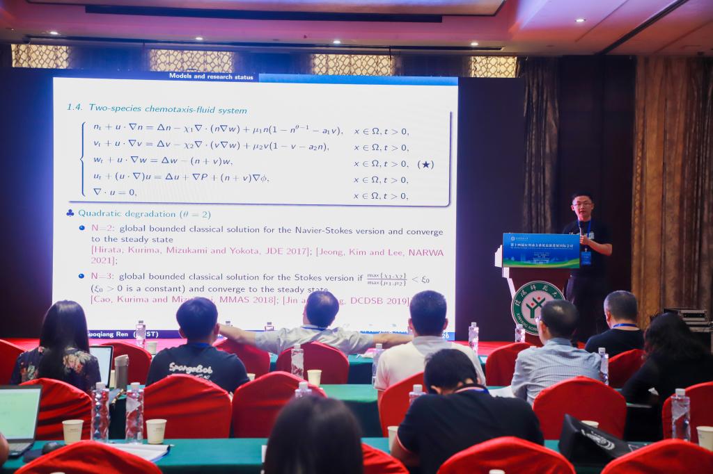 华中科技大学的任国强,做了题目为《Global solvability of a two-species chemotaxis-fluid system with Lotka-Volterra type competitive kinetics》的报告。