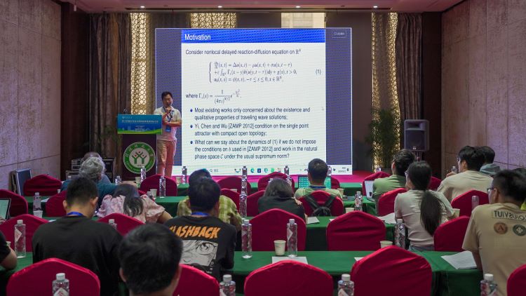 湖南师范大学的胡文杰,做了题目为《Exponential attractors for a nonlocal delayed equation on an unbounded domain》的报告。
