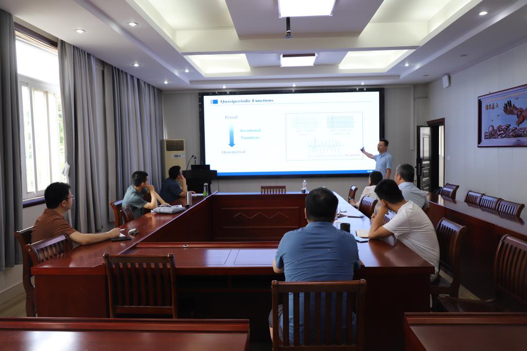 报告中,蒋教授重点讲解了其团队在准周期系统逼近上的最新进展,首先介绍了准周期函数的特点及其数学表示,阐述了用周期系统逼近准周期系统这种常规方法存在的不足。针对常规方法存在的问题,蒋教授团队率先提出了投影方法逼近准周期系统,进而开创性地提出了有限点插值恢复技术避免在高维环面上的计算,从而大大降低了逼近难度,做到逼近方法适用于低正则性情形。随后,蒋教授介绍了准周期系统逼近在准晶、量子信息和光学等众多领域的广泛应用,对我们了解这些结构有着重要意义。