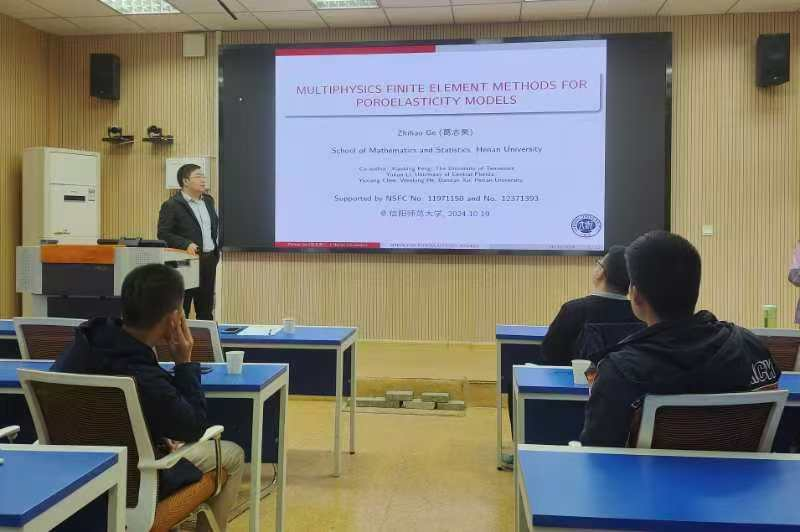 10月19日上午,应太阳集团tyc9728邀请,河南大学葛志昊教授作了题为《MULTIPHYSICS FINITE ELEMENT METHODS FOR POROELASTICITY MODELS》的学术报告。报告会由李世顺教授主持,部分老师及研究生聆听了此次报告。