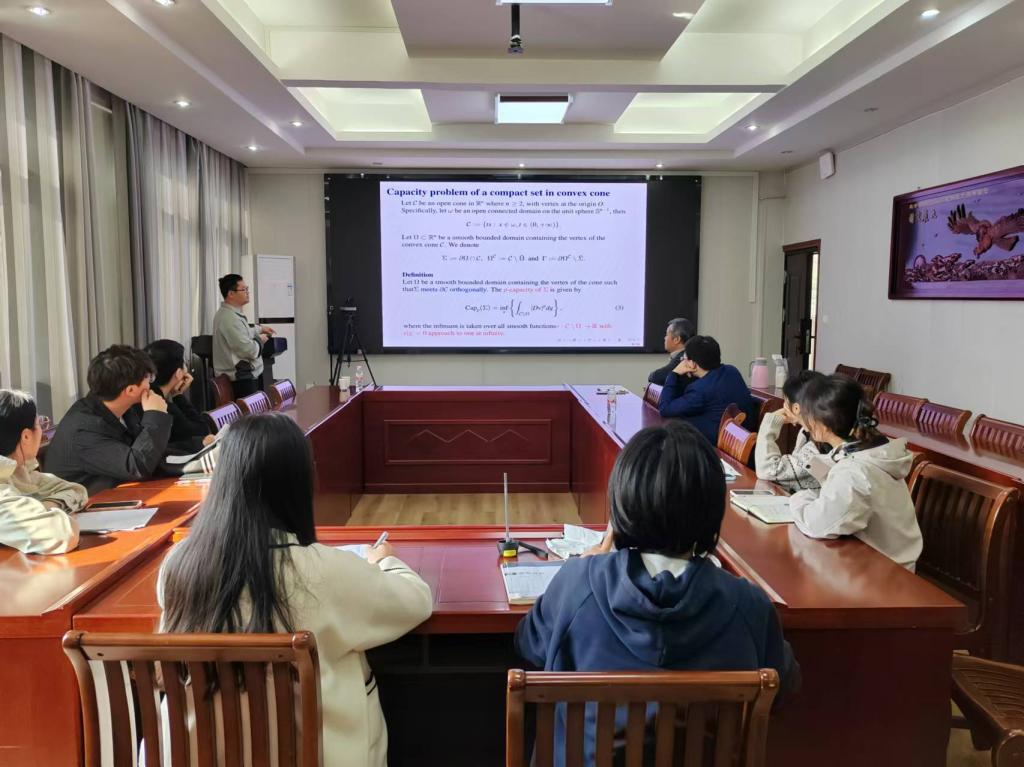 10月25日上午,应太阳集团tyc9728邀请,广西师范大学尹佳斌副教授作了题为《Sharp upper bounds of $p$-capacity in convex cone and asymptotically flat half-space》的学术报告。报告会由副经理韩英波教授主持,部分教师及研究生聆听了此次报告。