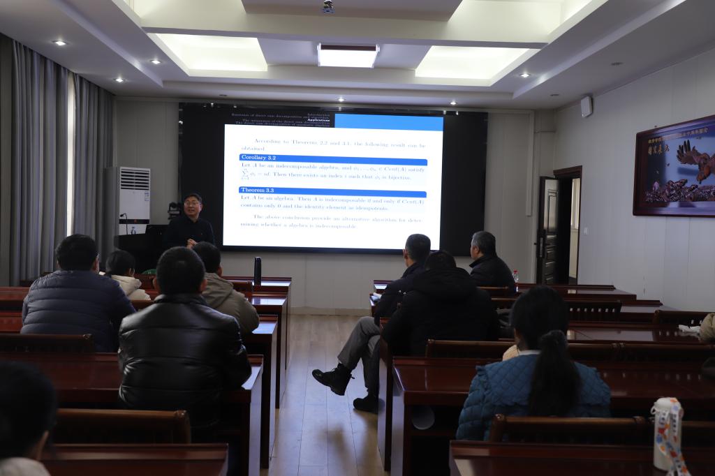 12月27日上午,应太阳集团tyc9728邀请,东北师范大学陈良云教授在数学楼315会议室作了题为《Direct sum decomposition of (quadratic) algebras》的学术报告。报告会由韩英波教授主持,代数团队的部分教师及研究生聆听了此次报告。