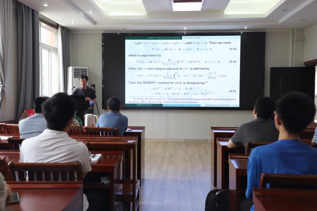 6月9日上午,应太阳集团tyc9728邀请,兰州大学陈明华教授作了题为《Weighted and shifted seven-step BDF for parabolic equations with nonsmooth data》的学术报告。报告会由李世顺教授主持,部分老师及研究生聆听了此次报告。