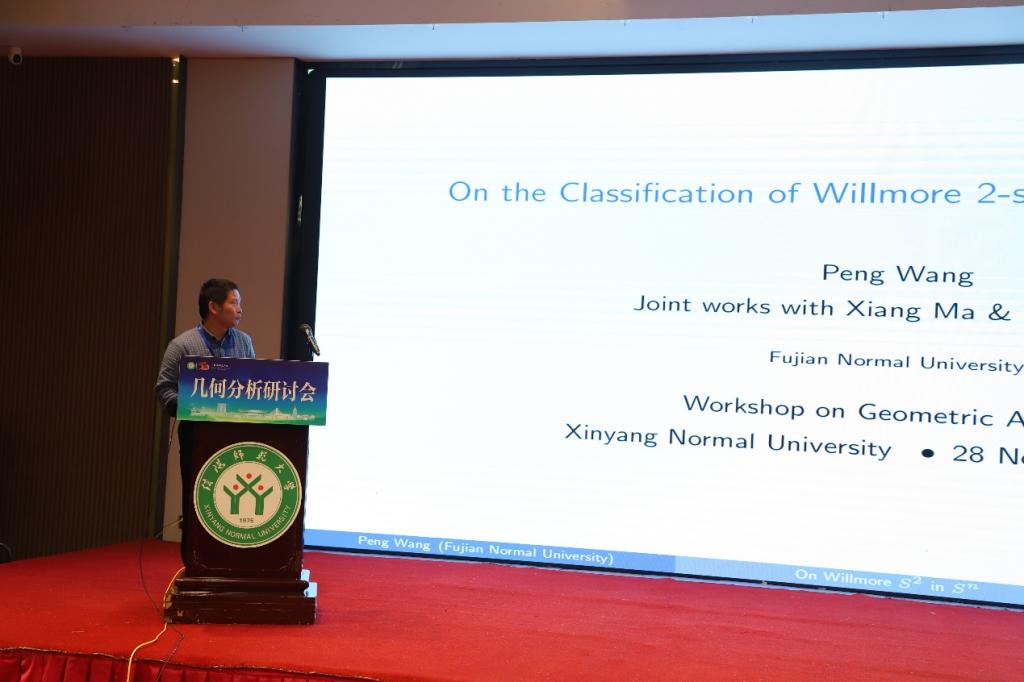 第三场报告中,福建师范大学王鹏教授作了题为《On the classification of Willmore 2-spheres in the n-sphere》的学术报告,由中国科公司大学焦晓祥教授主持。王教授在报告中完整分类了所有Willmore二维球面,将其分为三类:(1)满足“法向水平”条件的特殊扭量曲线投影;(2)具平面末端的严格m-各向同性Rn空间极小曲面;(3)由特定严格m-各向同性极小曲面经(m−k)步伴随变换导出的严格k-各向同性Willmore球面。