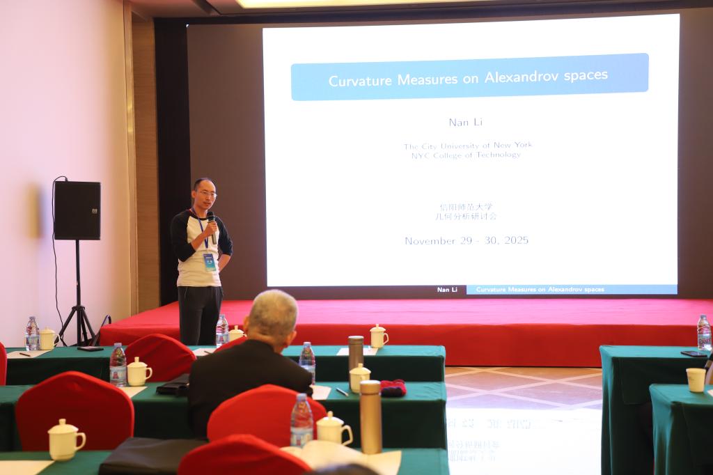 场报告由纽约城市大学李楠教授主讲,题目为《Curvature measures on Alexandrov spaces》。报告由台湾大学(上海数学与交叉学科研究院)张树城教授主持。李教授介绍了在具有下截面曲率界的奇异空间分层结构方面的最新进展与应用。