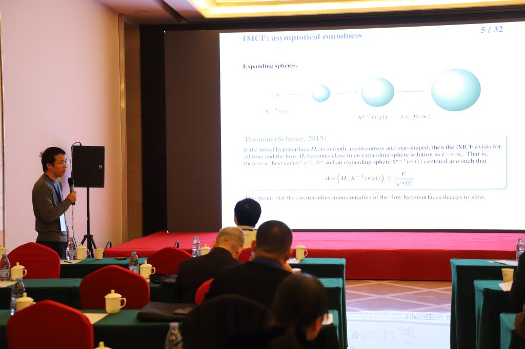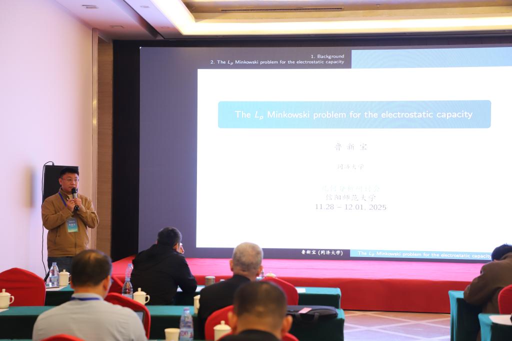 场报告由中国科学技术大学许小卫教授主持,同济大学鲁新宝教授作了题为《The Lp Minkowski Problem for the Electrostatic Capacity》的学术报告。静电容量的Minkowski问题最初由D. Jerison提出并解决(Acta Math. 176, 1996),是Minkowski类问题中一个极为重要的变体。鲁教授在报告中介绍了他在该问题上的最新研究进展,具体包括:对于  p > 1  的情形,证明了解的存在唯一性;对于  0 < p < 1  的情形,证明了解的存在性。