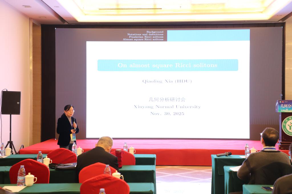 场报告由杭州电子科技大学夏巧玲教授主讲,题为《On almost square Ricci solitons》,主持人为重庆师范大学程新跃教授。夏教授在报告中引入了一类近似平方里奇孤立子,它由平方度量  F = (\alpha + \beta)^2 / \alpha  与  n  维流形  M  上的  C^2  向量场  V  共同定义,其中  \alpha  为黎曼度量, \beta  为1-形式。她证明的主要结论包括: 当  n \geq 2  时,(M, F, V) 构成近似平方里奇孤立子当且仅当  F  是里奇平坦的,且  V  是  F  的共形向量场;当  n \geq 3  时,(M, F, V) 为局部射影平坦的近似平方里奇孤立子当且仅当  F  具有零旗曲率,且  V  是  F  的Killing向量场。