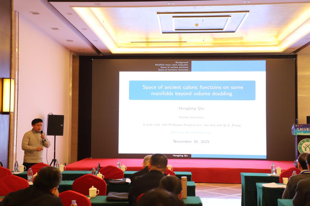场报告由武汉大学邱红兵教授主讲,题为《Space of ancient caloric functions on some manifolds beyond volume doubling》。报告由湘潭大学孙林林教授主持。在突破体积加倍限制的条件下,邱教授得到了流形上具有多项式增长的古老热函数空间的时间多项式结构结果。作为推论,该研究推广了[Colding-Minicozzi, Ann. Math., 1997]的结论。