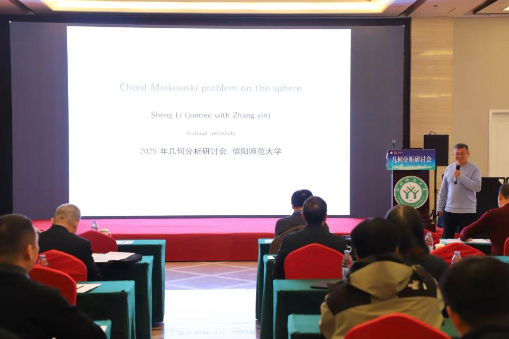 场学术报告由四川大学盛利教授主讲,题目为《Chord measure on the sphere and associated Minkowski-type problem》。本场报告由郑州大学胡泽军教授主持。盛教授运用球面弦积分的变分方法,深入探讨了球面上弦测度的相关性质,并提出并解决了一个与弦测度密切相关的 Minkowski 型问题。