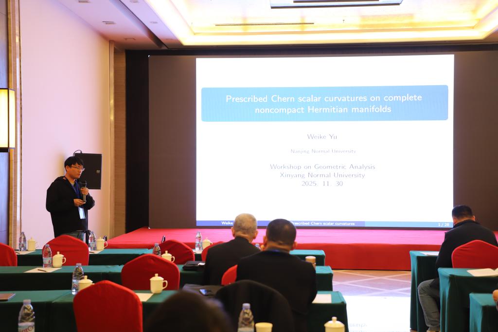 场报告由南京师范大学虞维科教授主讲,题目为《Prescribed Chern scalar curvatures on complete noncompact Hermitian manifolds》,主持人为浙江大学的赵恩涛教授。虞教授在报告中探讨了完备埃尔米特流形上的预定Chern标量曲率问题。他首先回顾了该问题的研究背景,随后聚焦于完备非紧流形上的情形,并将 Aviles-McOwen 在《J. Differential Geom.》21 (1985) 中的存在性结果,从庞加莱圆盘推广到高维埃尔米特流形。(初审:曾凡奇,再审:严辉银,终审:韩英波)