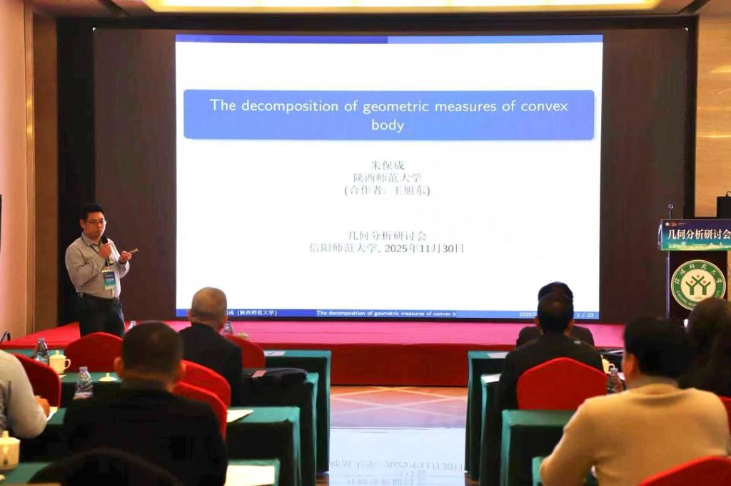 场报告由陕西师范大学朱保成教授主讲,题为《The decomposition of geometric measures of convex body》,报告由浙江大学的盛为民教授主持。朱教授深入探讨了凸体曲率测度的分解公式,该分解基于不同维度的豪斯多夫测度,并将这些测度限制在凸体边界的奇异集上。分解过程中的密度函数与奇异测度,均通过凸体广义曲率的函数积分予以明确表达。