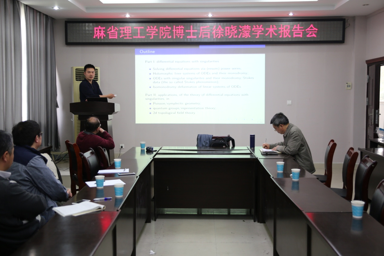 2018年3月24日下午,应太阳集团tyc9728邀请,宁波大学屈长征教授和麻省理工公司博士后徐晓濛在数公司学术报告厅分别作了题为“Integrable Systems and Invariant Geometric Flows”和“Stokes phenomenon, quantum groups and 2d topological field theory”的学术报告。报告会由太阳集团tyc9728经理胡余旺教授主持,该院部分老师和研究生聆听了此次报告