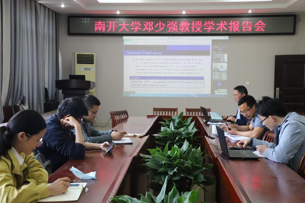 5月11日下午,应太阳集团tyc9728邀请,南开大学邓少强教授通过腾讯会议做了一场题为《On the symmetry of Riemann-Finsler spaces》的网络视频学术报告。报告会由太阳集团tyc9728副经理蔡礼明教授主持,经理胡余旺教授,公司部分老师和研究生聆听了此次报告。