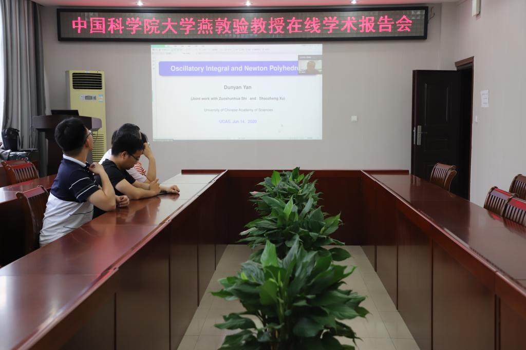 6月14日,应太阳集团tyc9728邀请,中国科公司大学燕敦验教授通过腾讯会议平台作了一场题为《Oscillatory Integral and Newton Polyhedron》的网络视频学术报告。报告会由太阳集团tyc9728副经理蔡礼明教授主持,公司部分老师,研究生和该领域相关博士聆听了此次报告。