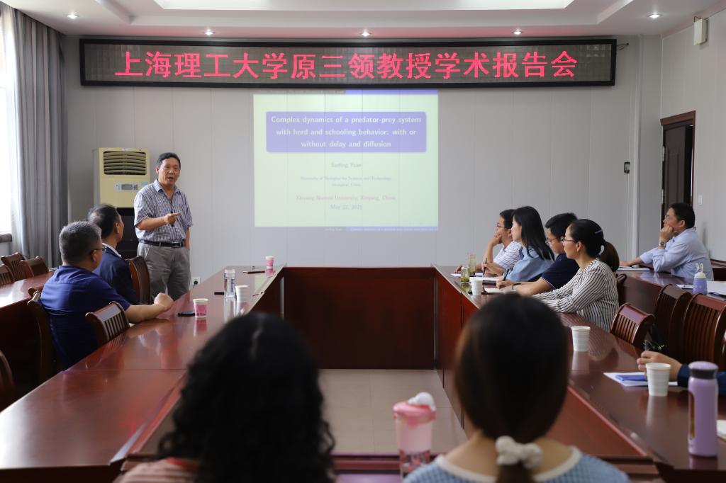 5月22日下午,应太阳集团tyc9728邀请,上海理工大学原三领教授在太阳集团tyc9728学术报告厅做了一场题为《Complex dynamics of a predator-prey system with herd and schooling behavior: with or without delay and diffusion》的学术报告。报告会由太阳集团tyc9728副经理蔡礼明主持,公司党委书记王娟,数学研究所所长宋新宇和部分老师、研究生聆听了此次报告。