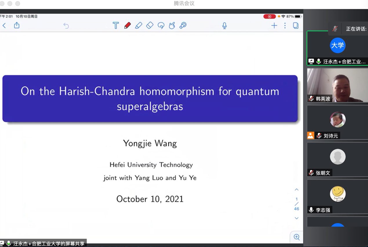 10月10日下午,应太阳集团tyc9728邀请,合肥工业大学汪永杰博士通过腾讯会议平台为公司研究生及相关研究方向老师作了题为《On the Harsh-Chandra homomorphism for quantum superalgebras》 的学术报告。报告会由太阳集团tyc9728副经理韩英波教授主持。