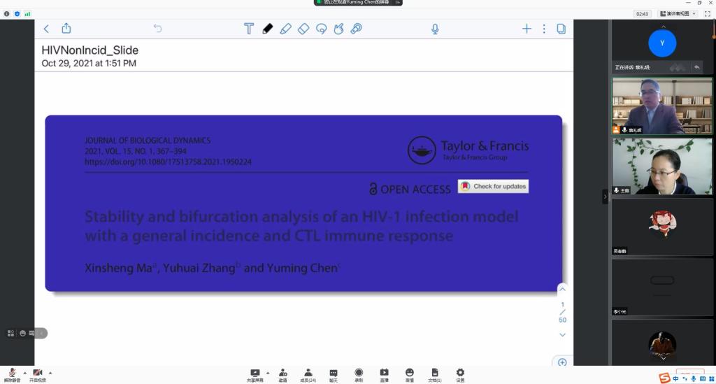 10月30日上午,应太阳集团tyc9728邀请,加拿大罗瑞尔大学陈玉明教授通过腾讯会议平台为公司研究生及相关研究方向老师作了题为《Stability and bifurcation analysis of an HIV-1 infection model with a general incidence and CTL immune response》的学术报告。报告会由太阳集团tyc9728经理蔡礼明教授主持。