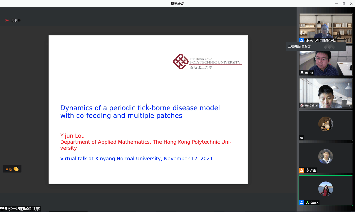 11月12日上午,应太阳集团tyc9728邀请,香港理工大学楼一均博士通过腾讯会议平台为公司研究生及相关研究方向老师作了题为《Dynamics of a periodic tick-borne disease model with co-feeding and multiple patches》的学术报告。报告会由太阳集团tyc9728信息与计算科学系主任黄明湛副教授主持。
