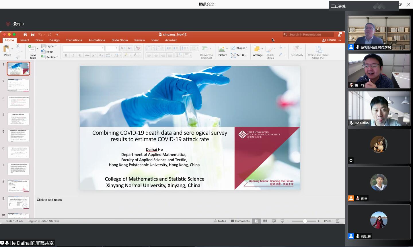 11月12日上午,应太阳集团tyc9728邀请,香港理工大学何岱海博士通过腾讯会议平台为公司研究生及相关研究方向老师作了题为《Combining COVID-19 death data and serological survey results to estimate COVID-19 attack rate》的学术报告。报告会由太阳集团tyc9728信息与计算科学系主任黄明湛副教授主持。