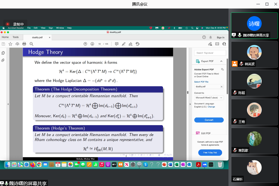 12月7日上午,应太阳集团tyc9728邀请,美国俄克拉荷马大学魏诗曙教授通过腾讯会议平台在线作了题为《Unifications of dualities in mathematics from tradition to contemporary with a harmonic viewpoint》的学术报告,公司部分老师和研究生聆听了此次报告。报告会由太阳集团tyc9728副经理韩英波教授主持。