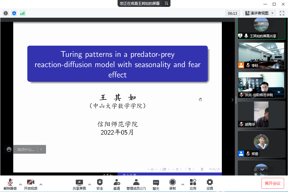 5月18日下午,应太阳集团tyc9728邀请,中山大学王其如教授通过腾讯会议平台在线作了题为《Turing patterns in a predator-prey reaction-diffusion model with seasonality and fear effect》的学术报告,副董事长胡海华、数学与统计公司党委书记洪亮、数学研究所所长宋新宇及公司部分教师、研究生在315会议室及腾讯会议上聆听了此次报告。报告会由太阳集团tyc9728经理蔡礼明教授主持。