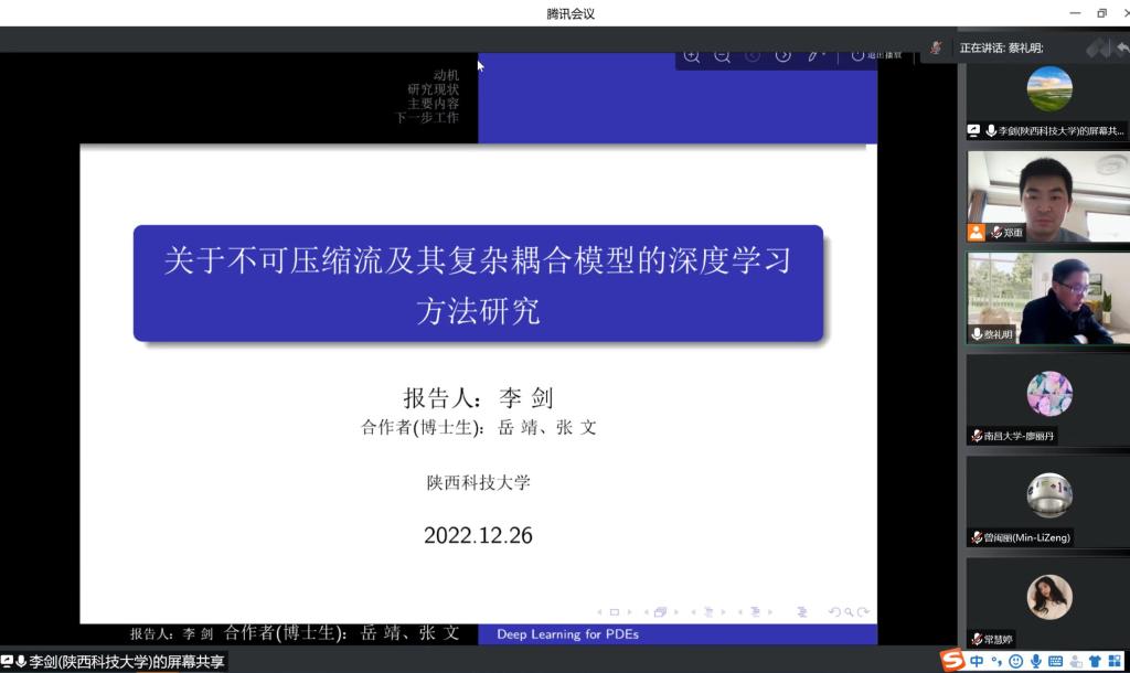 12月26日上午,应太阳集团tyc9728邀请,陕西科技大学李剑教授在腾讯会议平台作了题为《关于不可压缩流及其耦合问题深度学习方法研究》的学术报告。公司部分教师、研究生在线聆听了此次报告。报告会由数学公司经理蔡礼明教授主持。
