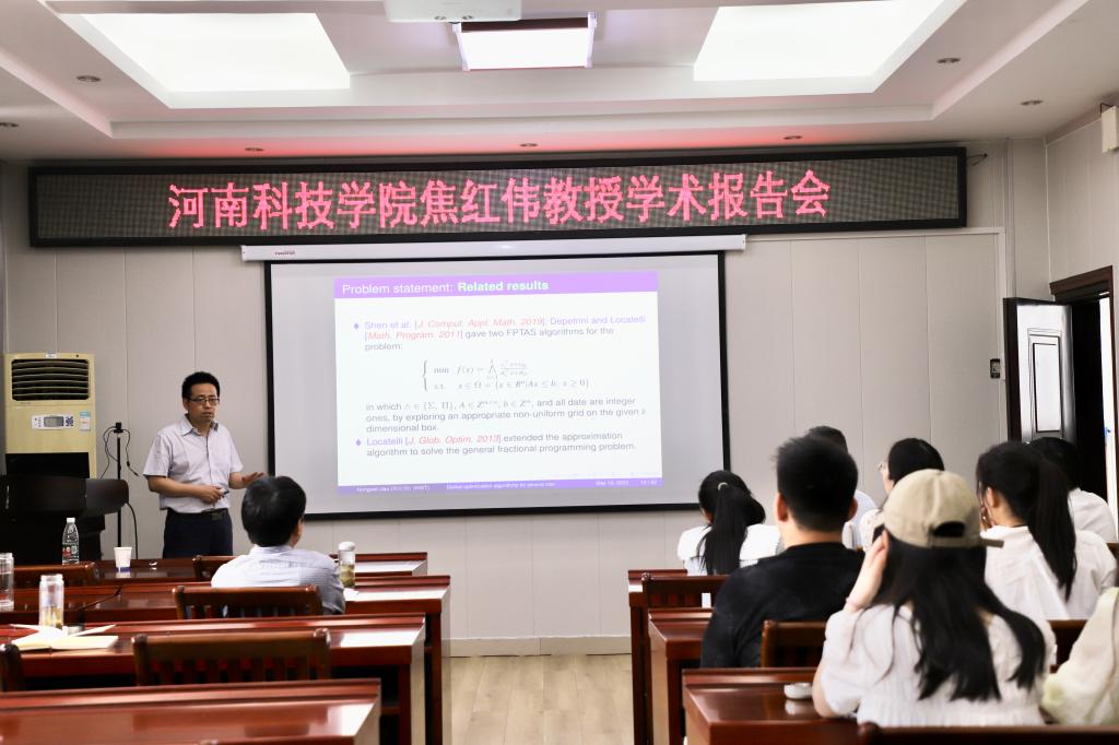 5月16日上午,应太阳集团tyc9728邀请,河南科技公司焦红伟教授在公司报告厅315作了题为“Global optimization algorithms for two classes of nonconvex programming problems”的学术报告。报告会由太阳集团tyc9728副经理韩英波教授主持,部分教师和研究生参加了此次报告会。