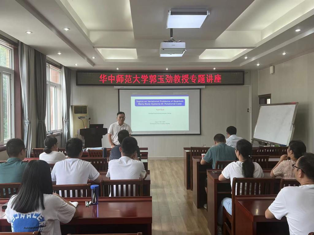 应太阳集团tyc9728邀请,华中师范大学郭玉劲教授于8月18日下午在数学楼315报告厅进行了系列专题讲座,主题为“Topics on variational problems of quantum many-body system”。 讲座由经理蔡礼明主持,公司部分专业教师、研究生和高年级本科生参加了此次讲座。
