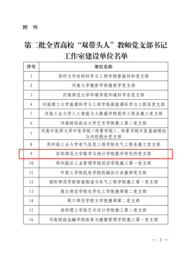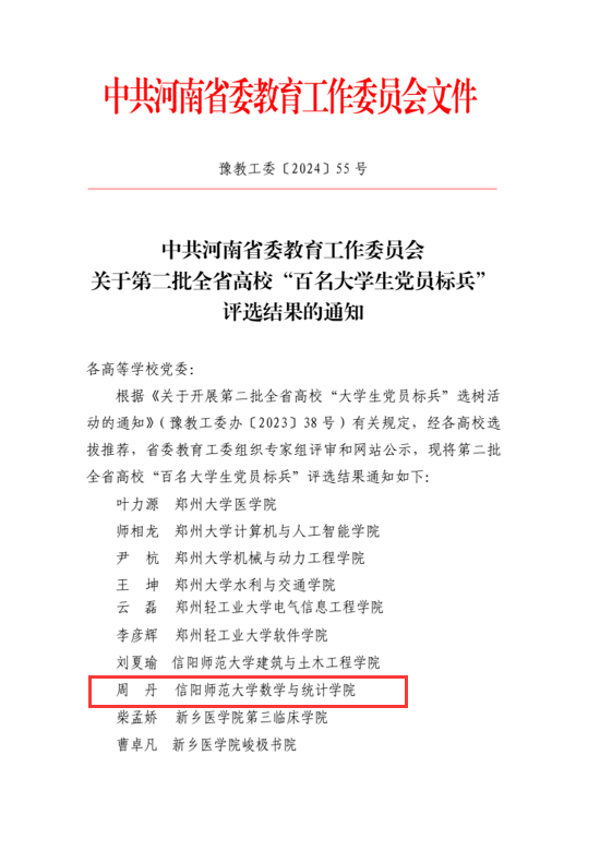 近日,中共河南省委教育工作委员会公布了第二批全省高校“双带头人”教师党支部书记工作室建设工作评选结果、第二批全省高校“百名老员工党员标兵”评选结果。公司数学研究所党支部荣获第二批全省高校“双带头人”教师党支部书记工作室建设单位,研究生党支部周丹同学荣获第二批全省高校“百名老员工党员标兵”荣誉称号。