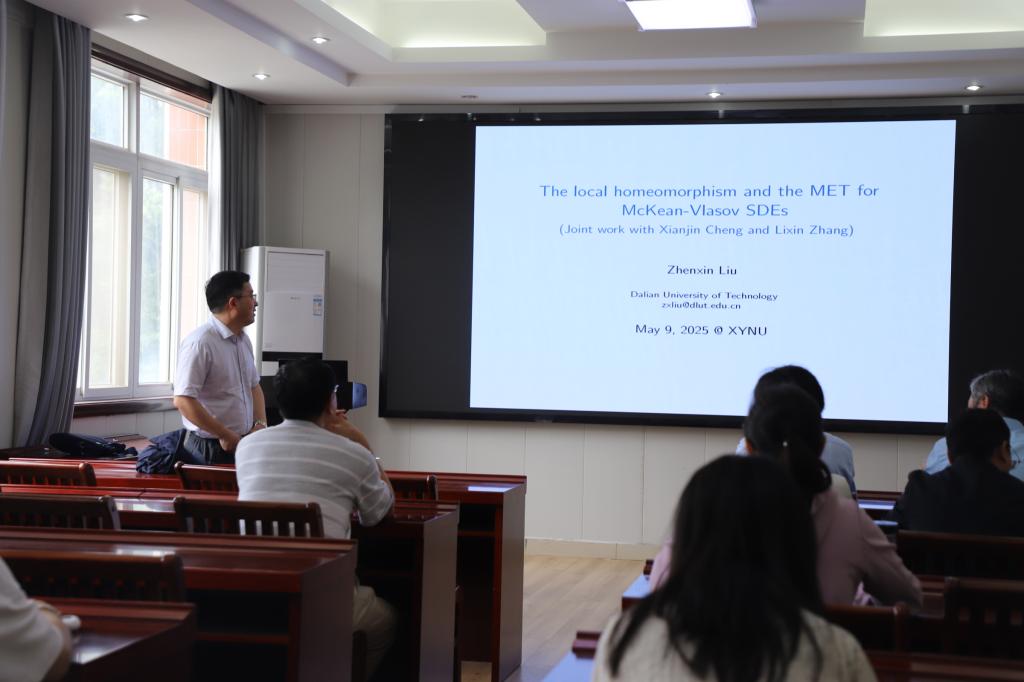 5月9日上午,应太阳集团tyc9728邀请,大连理工大学柳振鑫教授在数学楼315会议室作了题为 The locally homeomorphism property and the multiplicative ergodic theorem for McKean-Vlasov SDEs》的学术报告。报告会由太阳集团tyc9728经理蔡礼明教授主持,部分教师及研究生参加了此次报告会。