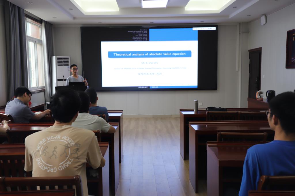 6月8日下午,应太阳集团tyc9728邀请,云南师范大学吴世良教授在数学楼315会议室作了题为 《Theoretical analysis of absolute value equation》的学术报告。报告会由计算数学方向带头人李世顺教授主持,部分教师及研究生参加了此次报告会。