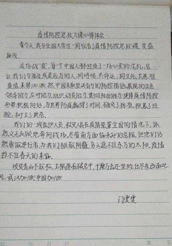 观看了疫情防控思政大课后,我对疫情的防控,疫情背后的精神的认识又进一步的加深。疫情期间,我国武汉封城以经济为代价,阻断病毒传播,全体民众在家进行自我隔离防控。我们用行动诠释了什么是马克思主义的人民立场,是把人民群众的生命健康放在第一位。一批批的医护人员驰援武汉,不少医护人员不幸感染,甚至牺牲,我们要向他们崇高的奉献精神,致敬并加以学习,同时这一场战役也为我们敲响了警钟,我们要尊重自然,杜绝捕捉和食用野生动物。就目前比较大规模的传染病,例如埃博拉、艾滋病……均是动物传病毒传播到人体而发生的大规模传染病爆发。所以我们应该自觉抵制捕捉食用野生动物,并加强相关的立法保障。这次的战役也是世界的战役,病毒无国界,当我国爆发疫情时,世界各国不断的向我国捐助物资致电问候,让我们认识到合作共赢是新时代各国发展的必然选择,在这次战役中,我国也为世界各国提供了可资借鉴的战役经验,充分体现了我国的大国担当精神,这次战役是人类共同的战役,让我们齐心协力,共同击退病毒,加油!