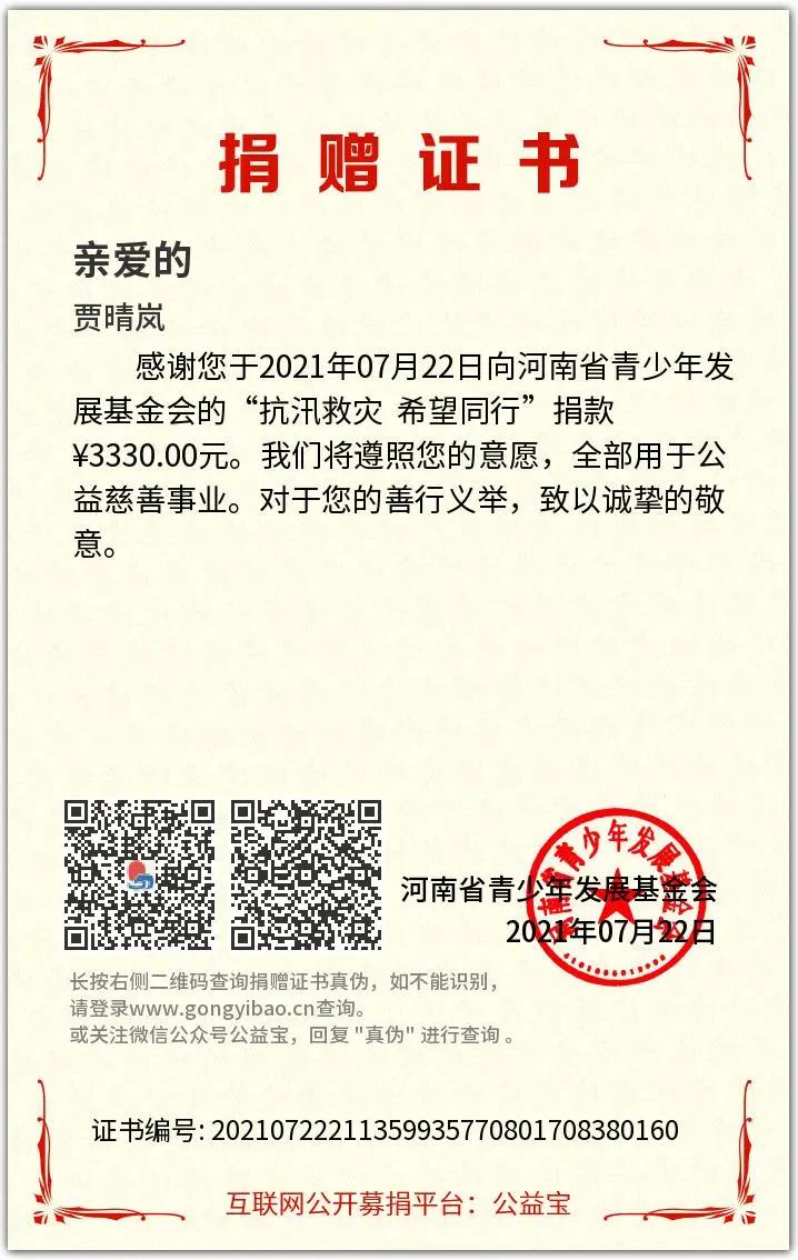 贾晴岚,2018级员工,中共预备党员,原公司员工会执行主席。看到受灾地区物资告急和募捐倡议书,贾晴岚没有犹豫,第一时间将自己的奖学金、比赛奖金和积攒的零花钱,共计3330元,全数捐给河南省青少年发展基金会。这笔钱原本是用来交学费的,对此,她说:“公司给我们奖学金是鼓励我们好好学习,回馈社会,成为对国家有用的人,这个时候,灾区人民比我更需要它。”