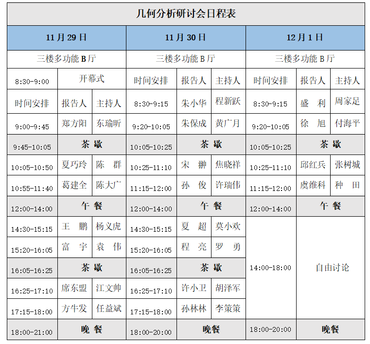 为了促进几何分析及相关领域的学术交流,推动公司数学学科的建设和发展,公司拟于2024年11月28日-12月2日在河南省公司举办几何分析研讨会,11月28日报到(信阳-中乐百花酒店),11月29日-12月1日会议报告,12月2日离开会议。会议将探讨几何分析及相关领域最新前沿问题的进展。希望会议能促进专家、青年研究者和研究生的交流与合作。