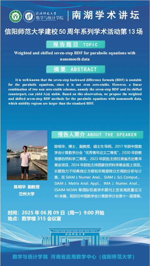 庆建校50周年之南湖讲坛:兰州大学陈明华副教授——Weighted and shifted seven-step BDF for parabolic equations with nonsmooth data